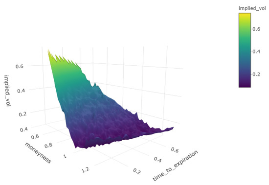 implied volatility surface in two index model. Note: This graph depicts the interpolated implied volatility surface (IVS). The time-to-maturity axis describes the term structure for options with different moneyness values (), while the moneyness axis describes the shape of “volatility smile” for options with different time-to-maturity.