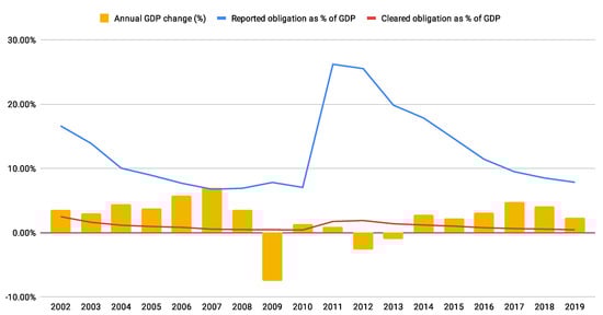 As shown in Figure 1, the liquidity saved was significant. The red line in the figure represents cleared obligations, the blue line represents the volume of obligations that were entered into the TCT system, and the yellow bars represent the annual GDP change (SURS 2020). In 1992, the first full year of system operation, 7.58% of GDP was saved, which enabled the economy to avoid an excessive rate of market exits or bankruptcies due to insolvency (DZRS 1993, 1994, 1995). The Slovenian fiscal institutions proved especially strong, capable of preserving the rather large revenue stream from taxes. Slovenia chose to reform the tax system only very gradually and the same gradualism was applied to the payment system, an approach that indeed played a crucial role in keeping tax revenues coming in. Because public revenue did not collapse, public services did not collapse either. As a consequence, in both cases (1991–1995 and 2009–2012) Slovenia went through short transitional recessions and until the current Covid 19-induced crisis hit enjoyed sustained growth, as shown in Figure 2 for the period 2002–2019 (AJPES 2002–2019).