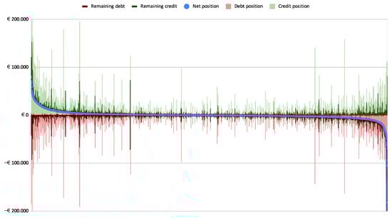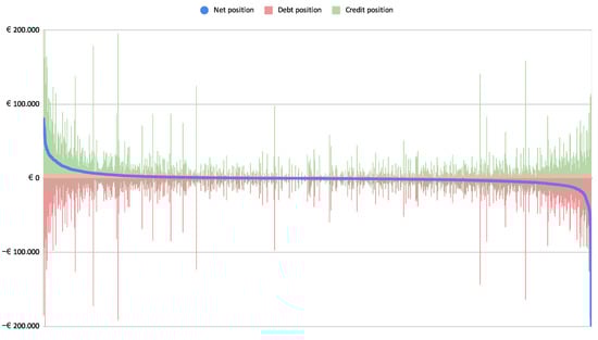 Each firm in an obligation network issues and/or receives invoices. The sum of all invoices issued by an individual firm is called that firm’s credit position. The sum of all invoices received by an individual firm is called that firm’s debt position. With these two numbers, we can calculate the net positions of individual firms in the Sardex community, as shown in Figure 6. The green columns represent the individual firms’ credit positions while the red columns represent their debt positions. The light blue line represents the net positions. Thus, firms are points on the horizontal axis sorted by the net position in descending order. The shape of the net position is typical for any obligation network. We can see that most firms have a net position close to zero. That does not mean they do not have much traffic. The spikes in credit and debit columns clearly show that many firms with near-zero net position trade in tens or hundreds of thousand credits (or “Euros” in our simulation) with other community members.