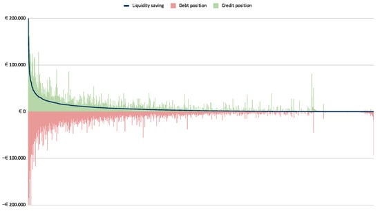 This situation is presented graphically in Figure 8 where, as in Figure 6, we can see the same light blue line of net positions. This is because removal of the cyclic structure does not change the net positions of individual firms. The difference, relative to Figure 6, is the inclusion of two additional curves: a dark green line on the credit side and a dark red line on the debt side of the plot. Together, they represent the new credit and debt positions of the firms that were part of the cyclic structure. This implies that for the firms that were not included these two lines reproduce the lighter spikes. We note that the dark green line indicating the credit positions of the firms in the remaining obligation network is always above the blue net positions curve, since the net position cannot be higher than the sum of all incoming cashflows. Similarly, the dark red line indicating the debt position of the firms in the remaining obligation network lies below the blue net positions line since the net position cannot be smaller (more negative) than the sum of all outgoing cashflows. The difference between the light columns and dark lines in Figure 8 represents the actual (“Euro”) liquidity savings for each firm.8 It is hard to estimate the total savings for the community from this figure, but it clearly shows that the savings are distributed across the community independently of the net positions of individual firms.