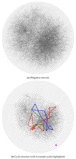 The result of TCT processing for the month of May 2019 is shown graphically in Figure 10. Figure 10a shows all the Sardex B2B transactions. The firms are represented as black dots and the invoices or obligations as gray arrows where the thickness of the arrow is proportional to the value of the obligation. Highly connected firms are positioned near the centre of the graph. This representation allows us to see that there are communities with more intense business activity and that these communities are well connected. Figure 10b shows the graph of the result of the TCT run to demonstrate the size of the cyclic structure in comparison to the obligation network. The graph of the cyclic structure contains the same firms as the graph of the obligation network (i.e., the same set of dots is used even if not all of them are connected) to make the visual comparison easier. As in part (a) of the figure, the gray arrows represent the individual transactions that are part of the cyclic structure. To visualize the complexity of the cyclic structure three individual cycles are highlighted in colour. The pink cycle is an example of a simple small cycle between three firms. It is an isolated example near the edge of the graph. The red and blue cycles are representatives of the most common type of cycle found in the cyclic structure—long and intertwined across different communities in the obligation network. The two green paths are “bridges” between the blue and red cycles but, together with the corresponding red and blue segments, they could also be interpreted as forming a fourth cycle that overlaps the other two. This is how overlapping cycles form the cyclic structure. Any attempt to treat the cycles individually, therefore, breaks the cyclic structure and diminishes the benefits to the community.