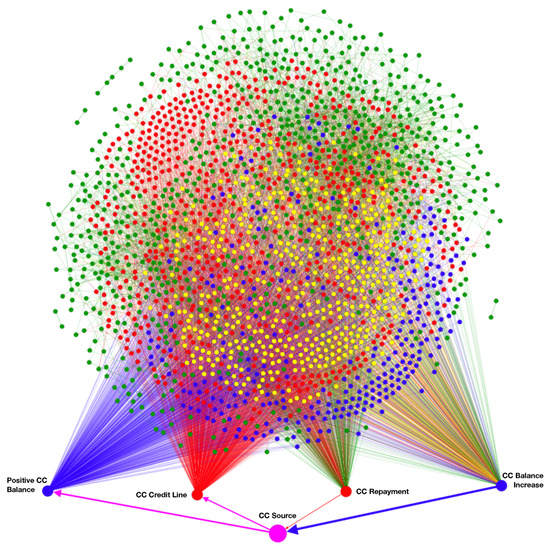 - Firms with a negative net position and positive CC balance get a link FROM the Positive CC Balance node (blue dot, bottom-left).—If their positive CC balance is smaller than their negative net position they may get an additional linkFROM the CC Credit Line node (red dot, second from the left).