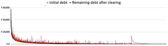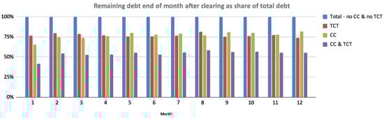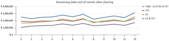 Observing the remaining debt in these different scenarios we can see that a CC similar to Sardex performs very similarly to obligation-clearing. However, the combined strategy is the clear winner. Using just 2% of annual turnover as a credit limit we consistently settle close to half of the invoices. This is a substantial liquidity-saving that gives the firms an opportunity to manage their Euro liquidity better and use it to finance new growth. Figure 14 shows the monthly remainders as a percentage of monthly invoice totals. January has a slightly different level since we started our model with no credits in the firms’ accounts. The levels even out after the first month of operation. Finally, Figure 15 shows the distribution of Euro debt remaining after the TCT and CC clearing step for the May 2019 example. This figure is analogous to Figure 9, which showed the savings for the whole year for TCT acting alone.