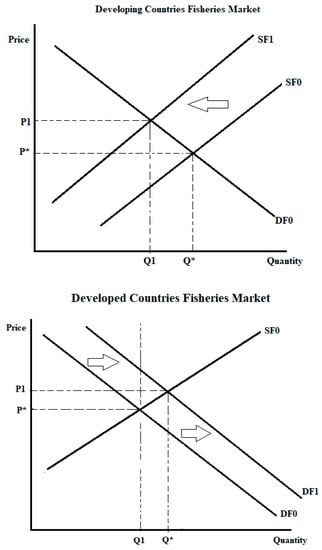 - Initially, the developing countries fisheries market is operating at a given quantity and price . The equilibrium revenue generated is therefore equal to the area . Note that this is the revenue which the developing countries’ fisheries sector generates with specific subsidies. The developing countries are able to attain the initial level with subsidies which are direct in nature. Also important to note is that most developing countries have limited vessel capacity. We show that with the provision of specific subsidies, some of the major developing countries who are also marine capture producers are able to compete with the developed countries’ fisheries market. Thus, both developed and developing countries are able to produce at their competitive of and based on the respective initial supply (SF0) and initial demand (DF0).