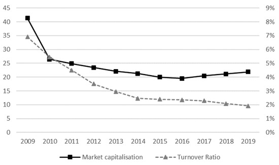 This study aims to explore whether the significant progress in the field presented above can be applied to the undeveloped and illiquid stock market. Such research is scarce as researchers and practitioners alike rather focus their efforts on markets in which data availability and reliability do not present a concern. For instance, Scientific Beta Universe Construction Rules (Scientific Beta 2020) state that criteria for inclusion in the “developed market universe”, among others, include a minimum total market capitalization of 60 billion USD and a minimum turnover ratio of 10%. The reported values refer to three-year averages and the turnover ratio, as a measure of liquidity, is calculated by dividing the value of stocks traded in a year by the average market capitalization of the actual and previous year. Based on the World Bank and Zagreb Stock Exchange data, the specified indicators for the Croatian stock market are presented in Figure 1. The plotted values clearly show that both are below minimal values with the turnover ratio exhibiting a downward trend.