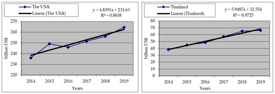 | The USA | y = 4.8391x + 233.63 | 0.88 | 0.94 |