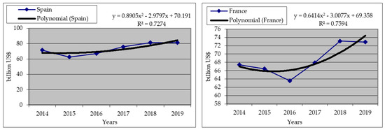 | France | y = 0.6414x2 − 3.0077x + 69.358 | 0.76 | 0.87 |