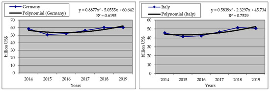 | Germany | y = 0.8877x2 − 5.0555x + 60.642 | 0.62 | 0.79 |