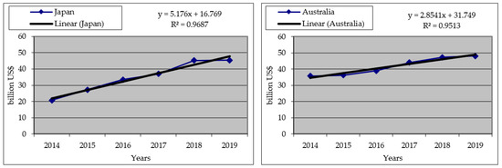 | Japan | y = 5.176x + 16.769 | 0.97 | 0.98 |
