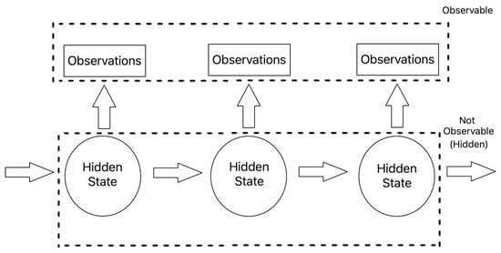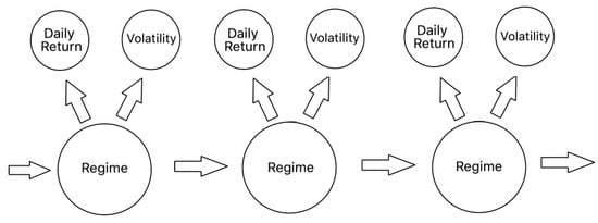The hidden Markov model (HMM) is a memory-less probabilistic model that models a time-series as a Markov chain, or a sequence of discrete, finite states (). In the past couple of decades, HMMs have been used in a wide variety of fields. One of the applications of HMMs is determining states in speech recognition (). Another popular use of the HMM is, like we will proceed to elaborate on in the paper, regime identification in the financial markets. The key difference between HMMs and regular Markov chains is that as the name suggests, the states in HMMs are hidden. As shown in Figure 1, instead of being able to observe the series of hidden states directly as one would with Markov chains, we can only observe the outputs of the hidden states. In general, there are two fundamental assumptions that the HMM makes: firstly, that all observations are solely dependent on the current state and are conditionally independent of other variables and secondly, that the transition probabilities are homogenous and depend only on the current hidden state ().