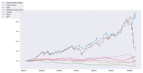 It’s important to recognize that the HMM regime-switching model essentially provides a methodology of conditionally switching the portfolio’s factor exposure and by proxy, style risk as well. This experiment empirically proves that such a model can improve your risk-adjusted returns through factor timing, a practice that entails exposing the portfolio to certain factors at times when those factors will deliver above-average returns (). In addition to factor timing, regime-switching models offer market timing skills to enhance investment performance. For instance, Dapena () relied on an HMM regime-switching model to determine risk-on and risk-off states for making active investment decisions. () used an HMM to time the individual asset and construct an asset allocation portfolio. In our paper, we provide a new methodology that delivers higher returns and results in better performance metrics by combining multiple investing models and rotating between these models through regime detection. As one can observe from the results in Figure 6, the HMM trading model performs more poorly than the value factor model during bull market runs. However, during market downturns like in December 2018 and March 2020, the HMM trading model switches from the twice-leveraged long-only value model to a market-neutral Fama French model which shields the portfolio from the drawdown it otherwise would have experienced.