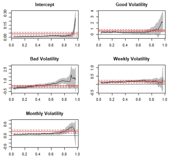 where and denotes the conditional quantile of the realized volatility conditional on the regressor variables for quantile . We estimate 95 quantiles from the 3% quantile up to the 97% quantile to obtain a precise picture of the relationships across different quantiles. Inference is based on bootstrapped standard errors.