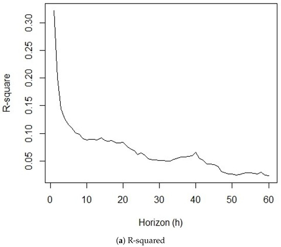 In line with Patton and Sheppard (2015), we extend our model to longer horizons to study the predictive power of the model. We find a decreasing predictive power for increasing forecast horizons. Figure 9a presents the R-squared values based on model 2 for all horizons from h = 1 to h = 60. There is a continuous decline in the R-squared values from 0.32 at h = 1 to 0.02 at h = 60. This is equivalent to a 94% drop in the R-squared value and is in stark contrast to Patton and Sheppard (2015) where the R-squared values drop from 0.61 to 0.31, at h = 66, a relative drop of about 50%. A plausible reason for this weaker forecasting power for increasing horizons in Bitcoin is the “excess” volatility in comparison to the equity market. The coefficient estimates become insignificant for increasing horizons and there is no clear pattern in the importance of good and bad volatility as shown in Figure 9b. The changing importance of good and bad volatility for different h supports our argument that volatility is not only high but that volatility of volatility is high and poor predictability is represented by an unstable and switching asymmetric effect.2