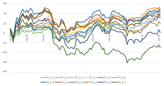 The three portfolios with the best performance are 1-1-2, 1-2-1, and 2-1-1. The first two share the feature of having low CV. There is one portfolio that ends with a negative cumulative return (2-2-3); it includes stocks with high CV, high Kurt, and high Skew. Portfolios 2-2-1 and 2-2-2 (high CV and high Kurt) are also among the worst performers.