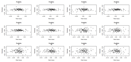 In order to confirm if the OLS hypotheses are fulfilled (normality, homoscedasticity, and independence), we performed several analyses similar to those in (Soumaré et al. 2013). A Shapiro–Wilk test was run on each set of residuals, suggesting that, in general, the residuals of the TS regression are normally distributed, except for portfolios 1-1-1 (p-value = ), 1-2-1 (p-value = ), and 1-2-2 (p-value = ). Additionally, charts of residuals vs. fitted values show that the homoscedasticity assumption is violated for portfolios 7 to 12 (high CV), see Figure 2. The Durbin–Watson test also suggests that errors may be autocorrelated for portfolios 2 to 6 (low CV). The autocorrelation charts plotted in Figure 3 indicate that residuals are especially correlated for lag equal to 1.