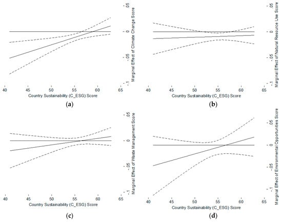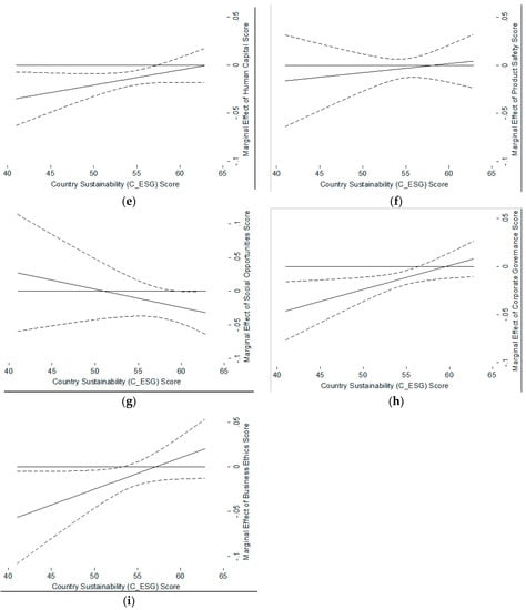 Then, we estimate the marginal effects of CSP dimensions across different values of country sustainability. These marginal effects are presented in Figure 1a–i. The results show that the marginal effects of climate change (model 1), human capital (model 5), corporate governance (model 8) and business ethics (model 9) are negative and significant for low values of country sustainability. However, the marginal effects of these CSP dimensions turn to be insignificant as the value of the country sustainability increases. In contrast, the results also show that the marginal effects of social opportunities (model 7) are negative and significant for high values of country sustainability. The remaining CSP dimensions appear to have an insignificant effect on credit risk regardless of the country sustainability value. Overall, the results suggest that country sustainability context matters in the relationship between CSP dimensions and credit risk.