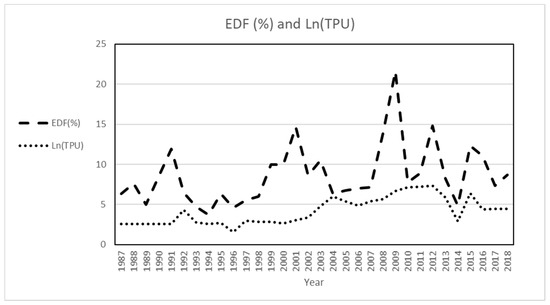 The figure plots cumulative EDF (%) and ln(TPU) during the sample period from 1987 to 2019. Source: Computed by the authors.