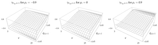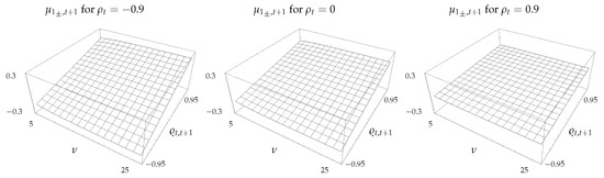The mean of the CSM return is shown in Figure 1 as a function of the degrees of freedom , and the spread autocorrelation, , for , , and . As expected, is an increasing function of . For , the mean decreases slightly with , while the opposite is the case when . In the region , the mean is slightly positive. Since this is the region corresponding to small autocorrelations in the underlying asset returns, and the situation most commonly observed in practice, it is reassuring that the small positive CSM returns implied by the model is consistent with the findings reported in the empirical literature. Moreover, we see that the degrees of freedom parameter, , that controls the kurtosis of asset returns has very little impact on . Interpreting small as representative of assets from emerging markets, this is consistent with findings from Rouwenhorst (1999) and Bekaert et al. (1997) that, although there is evidence of momentum in emerging markets, it is not significantly different to those observed in developed markets, despite the assets from the respective markets having different distributional properties. The surface flattens out as the cross-sectional correlation increases from to . Since an increase in corresponds to a decrease in the variance, , of the spread , this behavior is consistent with the positive relationship usually associated with risk and return in finance.