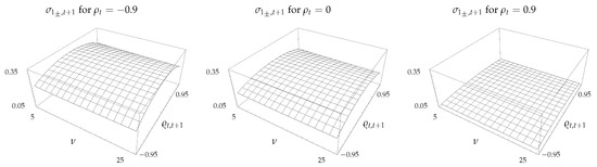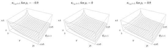 In contrast to the surfaces for other quantities that flatten to a large extent as increases from to , the surface for in Figure 4 remains relatively unchanged. The excess kurtosis of CSM returns is generally positive, in line with the findings reported in the literature, and increases significantly when is small and is high. It should be noted that is largest when is small. Since the deviation of the Student’s t distribution from the normal is greatest when is small, it follows that the extension considered in this paper will be useful in situations where the observed kurtosis in the CSM returns is higher than the value implied under the assumption of normal asset returns. This would be the case, for example, when considering emerging markets.