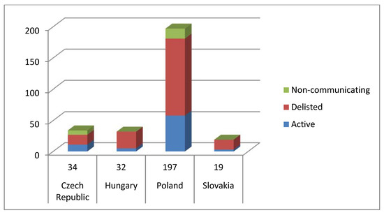 Despite their on-going integration into the Western world and the European Union, the post-transitional V4 countries, still bearing many burdens of their past in terms of business ethics (cf., e.g., Kliestik et al. 2018, pp. 792–93), belong to regions with a very low participation rate in the UNGC. With the exception of Poland, the countries can also be considered latecomers, as the first private entities from Hungary only joined in 2005, and from the Czech Republic and Slovakia in 2008, respectively. Until the middle of this decade, the numbers of participants from the V4 had been growing (for details on the dynamics, see Zemanová and Druláková 2016). However, with the exception of Poland, there has been a substantial decline in engagement since 2016. As a result, the total number of entities involved has almost stagnated, and, as can be clearly seen in Figure 1, inactive ones (i.e., in the language of the UNGC, delisted and non-communicating) have prevailed over those that regularly submit their COPs, and, thus, remain in the UNGC Participants Database.
