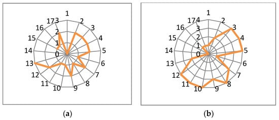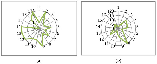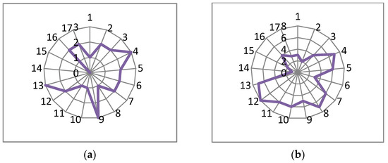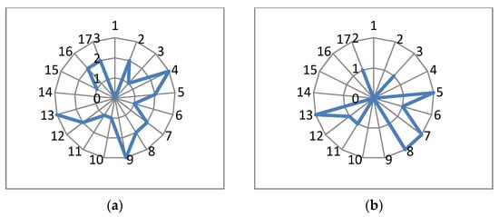 In the Czech Republic (Figure 2b), COPs submitted by companies in 2017–2019, according to the responses to the UNGC SDGs questionnaire, tended to address more challenging SDGs for the country, with the exception of SDG 13–Climate action. In addition, despite countries’ better performance in this area, their COPs also covered activities related to SDG 8–Decent work and economic growth, SDG 10–Reduced inequalities, SDG 11–Sustainable cities and communities, and SDG 12–Responsible consumption and Production, which might have correlated with their specific CSR concerns. Similarly, this was also true for Hungarian businesses (Figure 3b), with more emphasis on SDG 13–Climate action, in comparison to the Czech Republic.