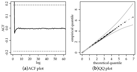 We now carry out an MC simulation study to examine the performance of the Cox–Snell residual defined in (22). To do so, we use the estimation procedure presented in Section 5.1 and consider only the BS-PE-ACD model, as it provides greater flexibility in relation to other models, that is, it has either less or greater (lighter or heavier tails) than the BS distribution. The BS-PE-ACD samples are generated using the transformation in (5). We simulate MC samples of size . The empirical autocorrelation function (ACF) of the residual is plotted in Figure 1a. This plot indicates that the BS-PE-ACD model is well specified, since the residual mimics a sequence of independent and identically distributed RVs and there is no indication of serial correlation. Moreover, the empirical mean of the residual , whose value was expected to be 1, was 0.9836. Finally, using a quantile-against-quantile (QQ) plot with a simulated envelope (see Figure 1b), we note that the Cox–Snell residual has an excellent agreement with the EXP(1) distribution, which supports the adequacy and flexibility of the BS-PE-ACD model. It is then possible to conclude that the residual seems adequate to assess the adjustment of the proposed models.