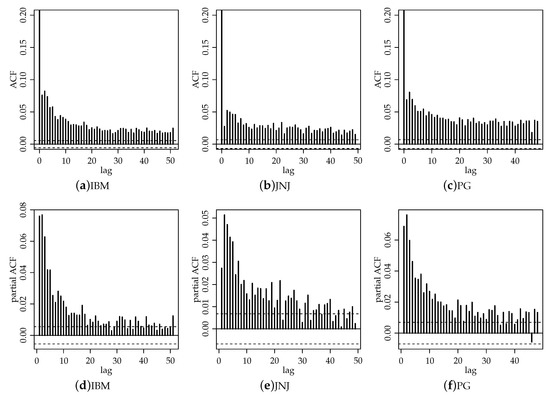 Table 3 provides some descriptive statistics for both plain and diurnally adjusted TD data, which include central tendency statistics and coefficients of variation (CV), of skewness (CS), and of kurtosis (CK), among others. These measures indicate the positively skewed nature and the high kurtosis of the data. Figure 2 shows graphical plots of the ACF and partial ACF for the IBM, JNJ, and PG data sets, which indicate the presence of serial correlation.