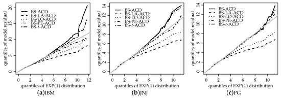 In order to check for misspecification, we look at the sample ACF from order 1 to 60. Table 4, Table 5 and Table 6 report that there is no sample autocorrelation greater than (in magnitude) throughout the models and residuals. Figure 4 shows the QQ plots of the Cox–Snell residual with the IBM, JNJ, and PG data sets. The QQ plot allows us to check graphically if the residual follows the distribution. These graphical plots show an overall superiority in terms of fit of the BS-PE-ACD model. Moreover, the empirical means of the residual for the BS-PE-ACD model with the IBM, GM, and PG data sets were 1.0271, 0.9990, and 1.0153, respectively. Thus, the BS-PE-ACD model seems to be more suitable for modeling the data considered. It must be emphasized that this model provides greater flexibility in terms of kurtosis compared to the BS-ACD model.