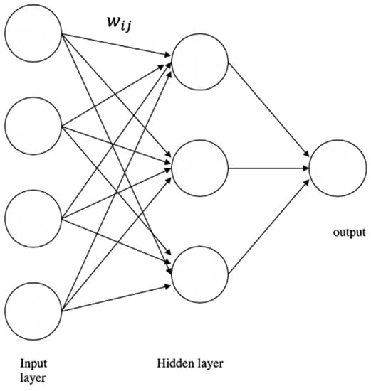 Inputs are summed by individual nodes. Then, adding a bias ( in the Figure 2), the result is substituted into a fixed function (Equation (37)). The results of the output units are produced in the same process with output function . Thus, the equation of a neural network is written as follows:
