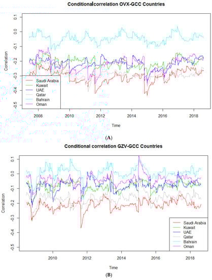 The conditional correlations displayed in Figure 1A,C are the output of the DCC Ht matrix, and they are naturally scaled between −1 and +1. Figure 1A portrays the dynamic conditional correlations between each GCC stock market and oil markets. It appears that the conditional correlations are negative from 2008 to 2018, indicating that higher volatility in oil markets induces lower stock returns in GCC. The highest conditional correlations are observed in Saudi Arabia and followed by Qatar, while the stock market in Bahrain is least-correlated with the oil market among its peers. Moreover, referring to both Figure 1A and Figure 2A, the co-movements between oil volatility and GCC stock returns tend to be most active during turmoil periods. The correlations between oil and the GCC stock markets increased during the periods of 2008–2009 (Global Financial crisis), mid-2011 (European Sovereign debt crisis), and 2014–2015 (oil price plummeting). For OVX-GCC countries, the average DCC coefficient is almost positive for Bahrain, whereas it evolves in negative territory for the other countries. For GZV-GCC countries, the average DCC coefficient is again mostly positive for Bahrain, whereas it evolves between −0.1 and −0.3 for other countries. For VIX-GCC countries, the difference is striking. Indeed, the average DCC coefficient of Bahrain becomes negative as well, oscillating until −0.2. The lowest DCC coefficient is recorded for Qatar below −0.3. This finding of negative correlations between oil shocks and stock returns is consistent with ex-ante expectations, and the general conclusions from the literature (see, for instance, Guesmi and Fattoum 2014; Delcoure and Singh 2018; Hammoudeh et al. 2013; Maghyereh et al. 2017).