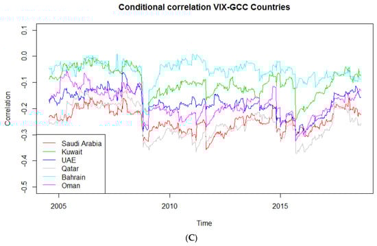 Lastly, Figure 1C and Figure 2C postulate the dynamic correlation between the VIX and GCC stock returns, as well as the historical values of the VIX index. The conditional correlations between each GCC stock market and the VIX index are generally negative, even within a more extended observation period (2005 to 2018). Interestingly, Figure 1C shows that the Bahrain stock market tends to behave independently to the shocks of international equity markets. The conditional correlation of VIX-Bahrain fluctuates mostly within 0.00 to −0.10, except for the negative correlations during the 2008 global financial crisis. Saudi Arabia and Qatar exert, again, the strongest correlations with the volatility measure as compared to the other GCC stock markets.