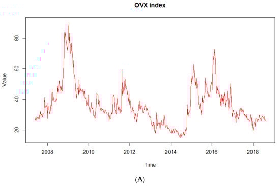 Given the conditional variance equations, Figure 1A–C below depicts the dynamic conditional correlations of each model. The historical values of the OVX, GVZ, and VIX indices are illustrated in Figure 2A–C, respectively, for a better comparison.