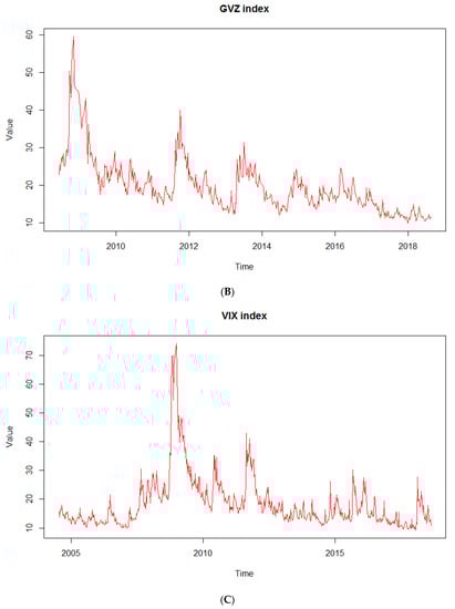 (A) OVX index, 14 May 2007–15 August 2018. Note: This Figure presents the index OVX. (B) GVZ index, 3 June 2008−15 August 2018. Note: This Figure presents the index GVZ. (C) VIX index, 4 July 2004–15 August 2018. Note: This Figure presents the index VIX.