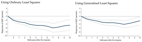 Romer and Romer (2017b) differ both in how they identify crises and their estimate of short-run costs. Based on their narrative analysis of Organisation for Economic Co-operation and Development (OECD) Economic Outlook Reports, they develop a finer crisis indicator ranging from 0 to 15 (integers).9 Figure 1, from Romer and Romer (2017a), shows that GDP is 4–5% below baseline seven quarters after a financial shock (an “impulse” in their crisis indicator) depending on the estimator.10 Although GDP “troughs” at about two years after the crisis begins, they estimate significant, persistent effects of five years or more.