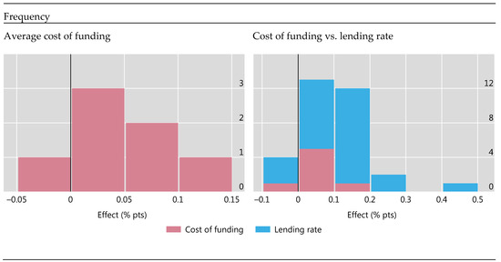 The right panel of Figure 4 compares the effect of bank capitalisation on the cost of funding (red) with the effect on lending rates (blue). As noted, most of the estimates for the lending rates come from the recent LEI and central bank studies. Most of the cost-of-funding estimates come from the academic literature. The shift from the red to the blue distributions suggests, implausibly, that changes in the cost of funding are passed through to loan rates more than “one-to-one”.