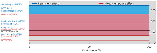 Figure 6 compares estimates of the economic cost of a crisis across studies (this is a graphical representation of row 7 of Table 1). Following the literature, costs are expressed as a percent of GDP, discounted to the present. The cost estimates are drawn flat with respect to capital ratios reflecting that all studies, by assumption, rule out any stability benefits from capital in terms of reducing crisis cost. Not surprisingly, the assumed permanence of the effects of a crisis is an important determinant of cost estimates; studies that considered permanent effects of a crisis tended, though not always, to have higher crisis costs. The range of cost estimates in BCBS (2010) is quite wide, as the upper bound (assuming permanent effects) and the lower bound (assuming mostly temporary effects) encompass all the other estimates except for those of Almenberg et al. (2017), based on data from Sweden. The median BCBS (2010) crisis cost estimate of 63% of GDP is well below the average estimate of 98% of GDP for the optimal capital studies.