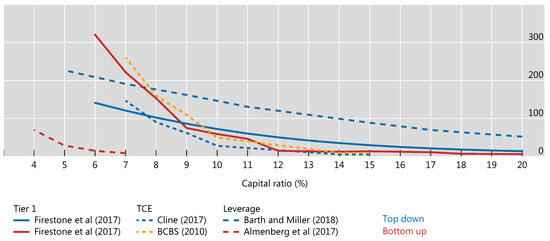 While the top-down models all control for financial crisis drivers, e.g., credit/GDP, none seem to control for real drivers, such as GDP growth. That is notable, because crises are often preceded by real growth slowdowns which may even “set the stage” for the crisis while at the same time reducing bank capital via lower loan demand and higher loan losses. Omitting real drivers from top-down models may confound the stabilising effect of stronger growth and higher capital (see Appendix B). The bottom-up method involves estimating the distribution of bank-level losses, then using simulations to estimate the probability of such losses reaching crisis levels by depleting banking system capital to crisis proportions. The study by the Federal Reserve Bank of Minneapolis (2017), for example, following Dagher et al. (2016), converts peak nonperforming loans that are sustained in crises to equivalent capital losses, then estimates the marginal benefit of additional capital in averting a crisis or bailout.