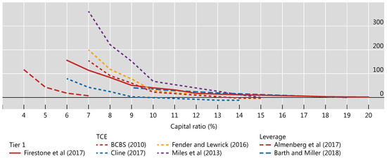 - Barth, James R., and Stephen Matteo Miller. 2018. Benefits and Costs of a Higher Bank Leverage Ratio. Journal of Financial Stability 38: 37–52. [Google Scholar] [CrossRef]