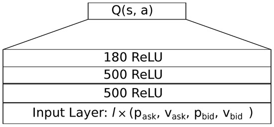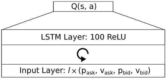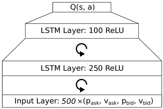 We investigate both a feedforward and a LSTM architecture. Both architectures feature the same input and output layers setup, but have different hidden layers. The input layer contains the state s, in form of a tick data sequence with length l. As for the output layer, the neural network approximates the Q-values for each action in the action space . To approximate these values, we use an output layer of neurons, each neuron with linear activation. Each action may invoke a different trade order.