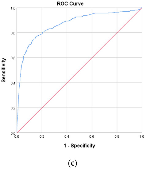 ROC curve of the general agricultural model of Slovak enterprises. (a) ROC curve in 2018; (b) ROC curve in 2017; (c) ROC curve in 2016.