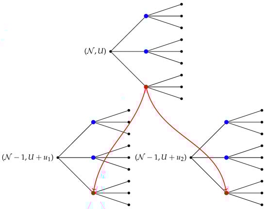 Figure 1 is a diagram of a section of a Forest of Stochastic Trees with two volume choices, and . It illustrates the nodes in the forest which need to be considered when making an exercise decision given state (). The three choices are no exercise, exercise units, and exercise units.