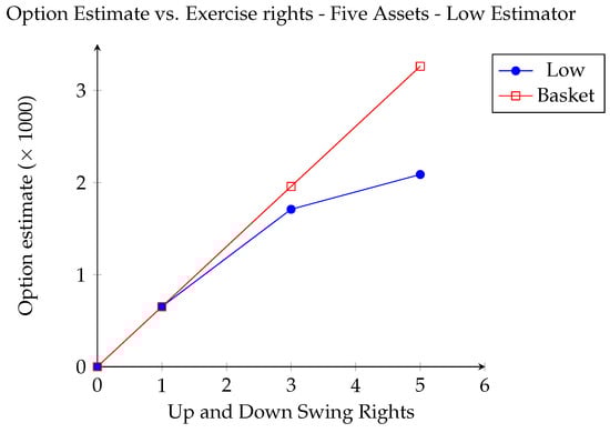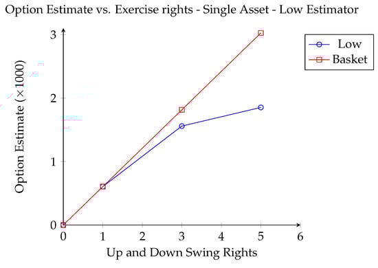 For the case of one up and one down swing right the basket of American options would contain a single call corresponding to the up swing right and a single put corresponding to the down swing right, with equal strike prices for the call and put. Changing the number of up and down swing rights invokes a change in the corresponding number of call and put options in the basket. Figure 3 shows a comparison between the values of a basket of American options and a swing option with a comparable number of exercise rights. The value of the basket is linear in the number of exercise rights and the swing option value is below the value of the corresponding basket when the number of rights is greater than one. This follows from the restriction that only one swing right may be exercised at any exercise opportunity whereas all American options of a particular type could be exercised at a given time. In the case of one up and one down right the two are equal since it would never be optimal to exercise both the put and call style rights at the same time. As the number of rights increases, the difference in values increases due to the swing option restriction allowing only a single right to be exercises at each opportunity. The low-biased estimator is used for both the basket and swing option values in Figure 3.