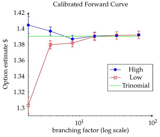 Option value estimates (USD) vs. log branching factor (b) with a single underlying asset. The option has one up and one down swing right, 3 exercise opportunities, exercise volume of 60 units of the underlying and there is no usage penalty. The initial price is USD 40. The number of repeated valuations results in standard errors ≈ 0.07% of option value.