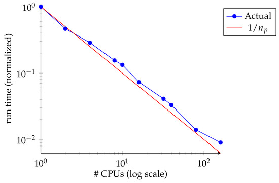 All simulations in this subsection were completed on the SHARCNet cluster Whale. Whale is located at the University of Waterloo and consists of Opteron 2.2 GHz processors (four per node) with a Gigabit Ethernet interconnect. Timing results listed below are given in total cpu time accumulated which is approximately equal to (program runtime) × (number of processors used).