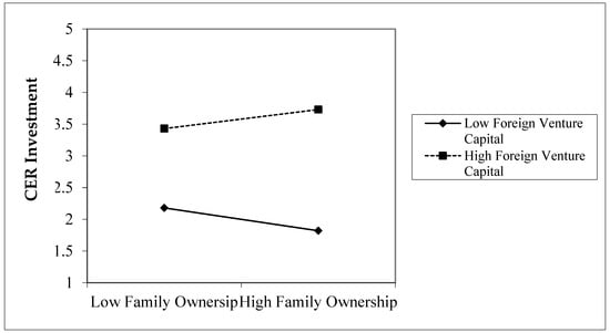 We find strong support (β = 0.28, p < 0.05) for the negative moderating effect on the negative relationship between family ownership and CER investments when venture capital comes into play—the relationship is reversed—in that high family ownership leads to more CER spending with the introduction of venture capital investment. This showcases the strength of having high family ownership under specific circumstances. In this case, venture capitalists from developed markets represent opportunities for global expansion and heightened growth potential, and the increased level of competition in the global arena acts as a wakeup call on family managers to raise their bar on CER initiatives. When family ownership is concentrated, it is easier for the firm to reach consensus and follow the venture capital’s lead to increase CER spending. Consistent with the literature drawing on agency-stakeholder theory, which states that family firms with concentrated ownership pay more attention to internal stakeholders than regulatory and market stakeholders when it comes to environmental management (). Once venture capitalists take on equity stake within the firms, family managers consider them as internal stakeholders. Thus, they pay more attention towards their advice and suggestions, especially when compared to the marketization influences in the external institutional environment, which is considered to be external stakeholders and inevitable placed on the back burner.