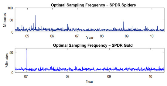 Figure 1 plots the optimal sampling frequency in minutes for SPDR Spiders and SPDR Gold. The optimal sampling frequency is estimated using Equation (8). These plots show that the optimal sampling frequency is time varying. This is due to the stochastic nature of the noise to signal ratio. It is high (low) when the signal of the underlying price process is large (small) relative to market microstructure noise. These plots exhibit occasional spikes in the optimal sampling frequency on days when the noise is relatively high, leading to lower sampling frequencies relative to other days in the sample.