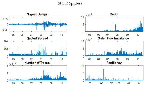 Figure 2 plots intraday signed jumps, trading activity, and liquidity variables generated at the optimal sampling frequency. The top panel of the figure shows the time series of SPDR Spiders variables. Signed jumps in the SPDR Spiders series are of a significantly larger size post-2007 and tend to occur more frequently in the second half of the sample period. Large jumps tend to occur during periods of market turmoil and are mainly observed during the GFC and the flash crash of 2010. The quoted spread tends to be decreasing over time; however, it is frequently interrupted by large spikes, which represent higher trading costs. These spikes cluster during the GFC and periods of high uncertainty in the market. The SPDR Spiders, however, exhibited a structural increase in the number of trades and market depth over time. This is likely due to the growth in the ETF industry and the increased use of ETFs as investment and risk management instruments. The figure also shows rising levels in the order flow imbalance post-2007 with occasional spikes in the time series, indicating increasing levels of adverse selection among market participants. In addition, the plot shows improvement in resiliency over time, although the realization of sporadic spikes implies an occasional deterioration in liquidity and recovery time. The bottom panel of Figure 2 plots intraday signed jumps, trading, and liquidity variables for the SPDR Gold series at the optimal sampling frequency. The plot reveals similar behavior to that depicted by the SPDR Spiders time series; however, SPDR Gold experienced a significant decline in transaction costs post-2008. This is likely due to competition between dealers, especially in over the counter (OTC) markets where transaction costs are negotiables between the parties. It is noted that occasional large spikes were removed from the plots to avoid dwarfing displayed dynamics of liquidity and trading activity variables.
