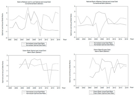 The vertical axes of Figure 1, Figure 2, Figure 3, Figure 4 and Figure 5 represent the debt ratios, while horizontal axes represent the years. First, Figure 1 shows the optimal debt against actual-debt ratios for the four banks under study in Bahrain. Similarly, Figure 1 shows optimal debt against the actual-debt ratios for the four banks under study in Kuwait. Then, Figure 3, Figure 4 and Figure 5 present the results for optimal debt against the actual-debt ratios for Malaysia, the United States, and the United Kingdom, respectively.
