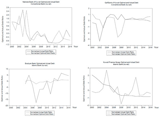 Next, the behavior of Kuwait banks is discussed. The graphs in Figure 2 exhibit the trends of the four banks in Kuwait. Optimal-debt ratio exhibited a trend similar to that of Bahraini banks, except for Boubyan Bank, where the optimal-debt ratio remained almost constant and close to zero throughout the years, while actual debt decreased over the years with some swings from one year to another. This constancy in optimal debt can be attributed to the astronomical increase in the gross revenue of the bank, which was equal to 80% in 2007, as well as the huge increase in total assets growth, equaling 48%, as per the bank’s balance sheets and financial statements. For the National Bank of Bahrain, up until 2005, optimal debt was high, dropped dramatically in 2006, and remained at this low level until 2011, when optimal debt increased again but at a moderate level. The Gulf Bank of Kuwait behaved slightly differently, as there was a decrease in optimal debt from 2000 until 2003, and then another increase until 2007, followed by a steep drop in late 2007. In 2009, optimal debt settled to an acceptable level until 2016. Kuwait Finance House had more frequent swings in optimal-debt ratio, while actual-debt ratio exhibited a smooth decreasing trend from 2000 until 2007, when the debt became well-managed and almost persistent. In general, Islamic banks in Kuwait managed their debts better than conventional banks did before, during, and after the financial crisis. Kuwait experienced a rapid expansion of the Islamic banking segment over the course of the past decade, in addition to Kuwait’s reputation as a center for Islamic banking and policies.