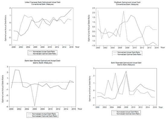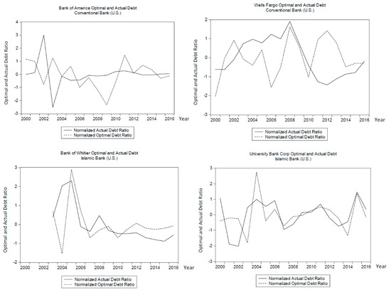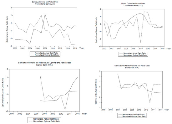 Lastly, for the United Kingdom, the strong conclusion can be made that Islamic banks leveraged less than conventional banks did prior to, during, and after the financial crisis. For Barclays, optimal debt was high between 2004 and 2007, while actual debt was high between 2007 and 2009. For Lloyds, optimal debt was not high, but had frequent swings of ups and downs between 2003 and 2009, when there was a sharp decrease, followed by an increase in 2010. Its actual-debt ratio was highest between 2005 and 2010, although it is not considered that high. Generally speaking, Barclays’ optimal debt decreased over time, while that of Lloyds remained approximately at the same level except for a strike in 2012. Lloyds, following its merger with the Trustee Savings Bank (TSB), took the market lead, which increased the bank’s efficiency, performance, and, consequently, the bank’s debt ratio (Wilson 1999).
